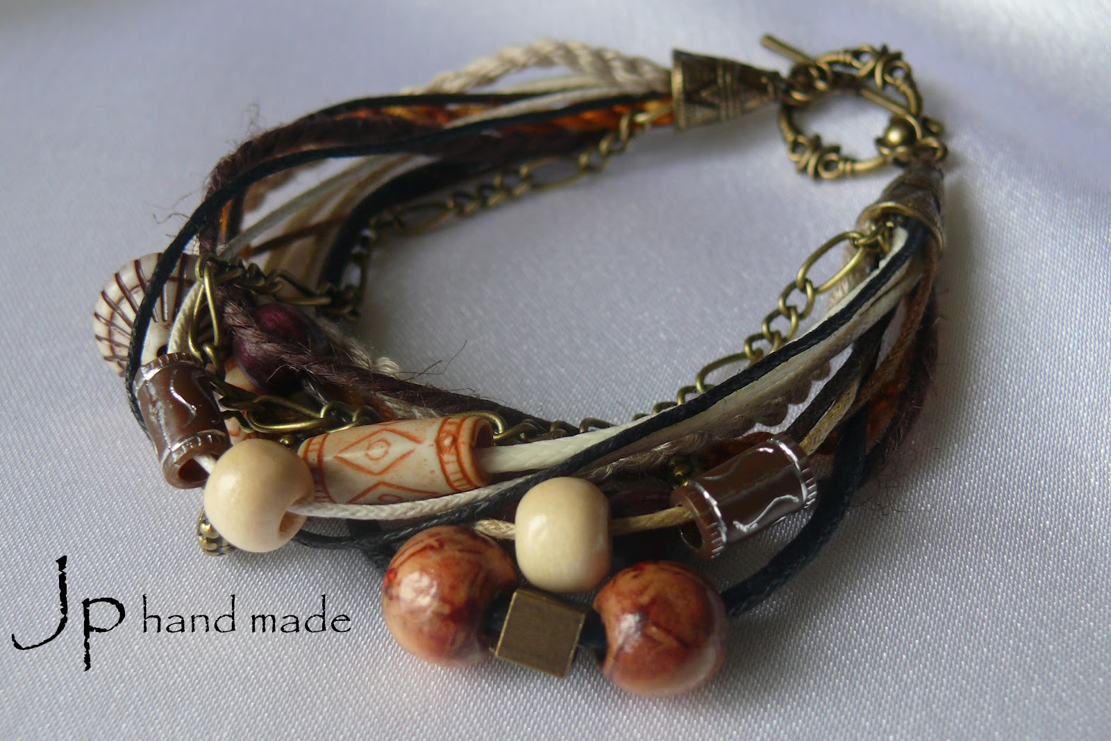 Для Даши, той самой заказчицы и главной идейной вдохновительницы, я делала браслет в коричнево-рыжей гамме. Использовала множество шнуров, разных и по цвету, и по фактуре, а так же различные бусины. Вся фурнитура под бронзу.